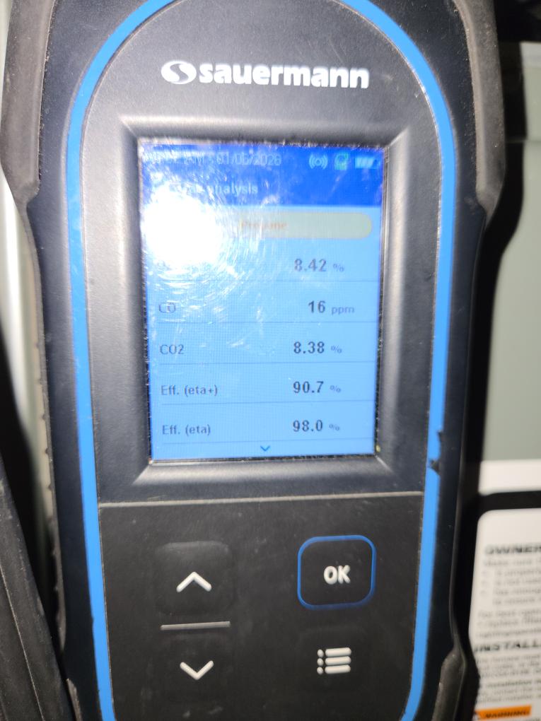 Completed the oil boiler maintenance today. I replaced the oil filter, pump strainer, and the nozzle. I brushed and vacuumed out the heat exchanger. All the boiler accessories looked good. I ran the unit and performed a smoke test and got zero smoke. Lastly I performed a combustion analyzer test that checks the units CO, CO2 and oxygen levels. The boiler was running great.