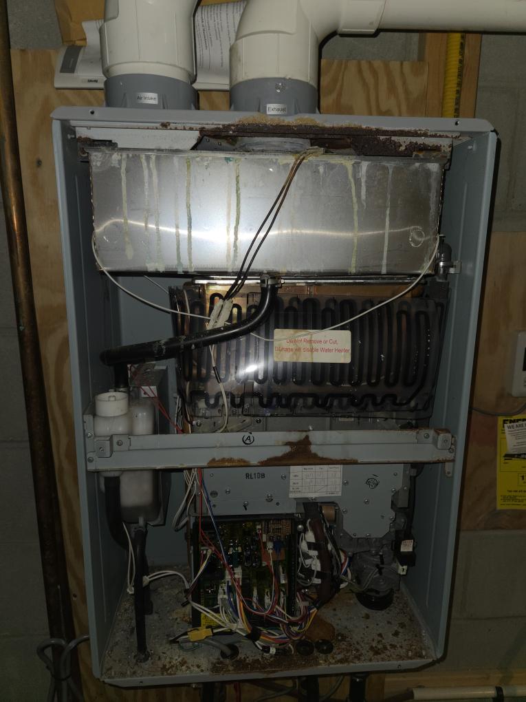I started off with replacing the failing inducer capacitor on the basement furnace. Next I replaced the furnace trap and re did the piping. I ran the furnace and tested operation and everything worked as it should and there was no leaks. Next I completed the plumbing maintenance. I started off with running a cleaner for 40 minutes through the Rheem tankless water heater. I then flushed 10 gallons of water through it. I pulled the inlet filter screen and I cleaned it. I vacuumed out the inside of the unit. There was a lot of rust and corrosion inside of the unit. I'd highly recommend thinking about replacing it since the unit is over 20 years old and doesn't look too good inside. Other than that there was no leaks and everything went good today.
